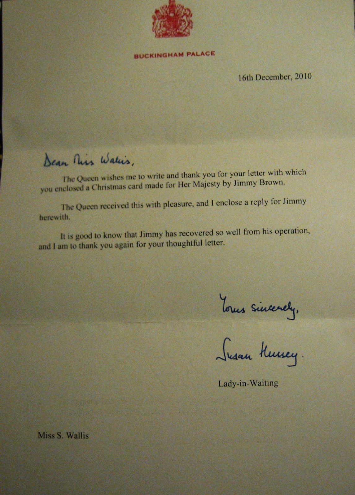 In the morning a starflake landed on my hair. Natalie and Caroline saw it and took a hasty picture!The nicest surprise of the day was a phonecall from Ann in the office this afternoon saying I had received a letter from the Queen! Just in the nick of time a letter was sent back to Jimmy. And one to me. Both lovely letters I thought. I took Jimmy's round to his class in the afternoon and his teacher read it out. When she said who it was from he looked pleased-and seemed happy he could keep it!